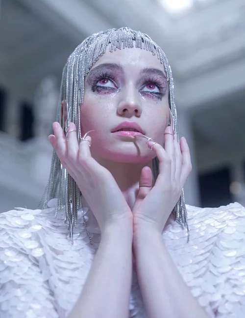 “Will You Undo Me Please?” is the last piece viewers experience in the installation. The bride stands on a 3’ platform facing away from the viewers, and her 20’ train cascades behind her onto the floor. The only other light source in the room is a projector pointed directly at the bride. Her white dress is illuminated with light shining through the gossamer and lace as it reflects off of sequins. Dried blood is evident on the dress and on the mannequin’s legs. The performer seems to be looking into an imaginary mirror and finding flaws in her face while continually fidgeting with her hands. The weight of the fabric upon the bride’s small stature prompts her to constantly adjust the dress. Her gaze searches for perfection and seems not to find it.