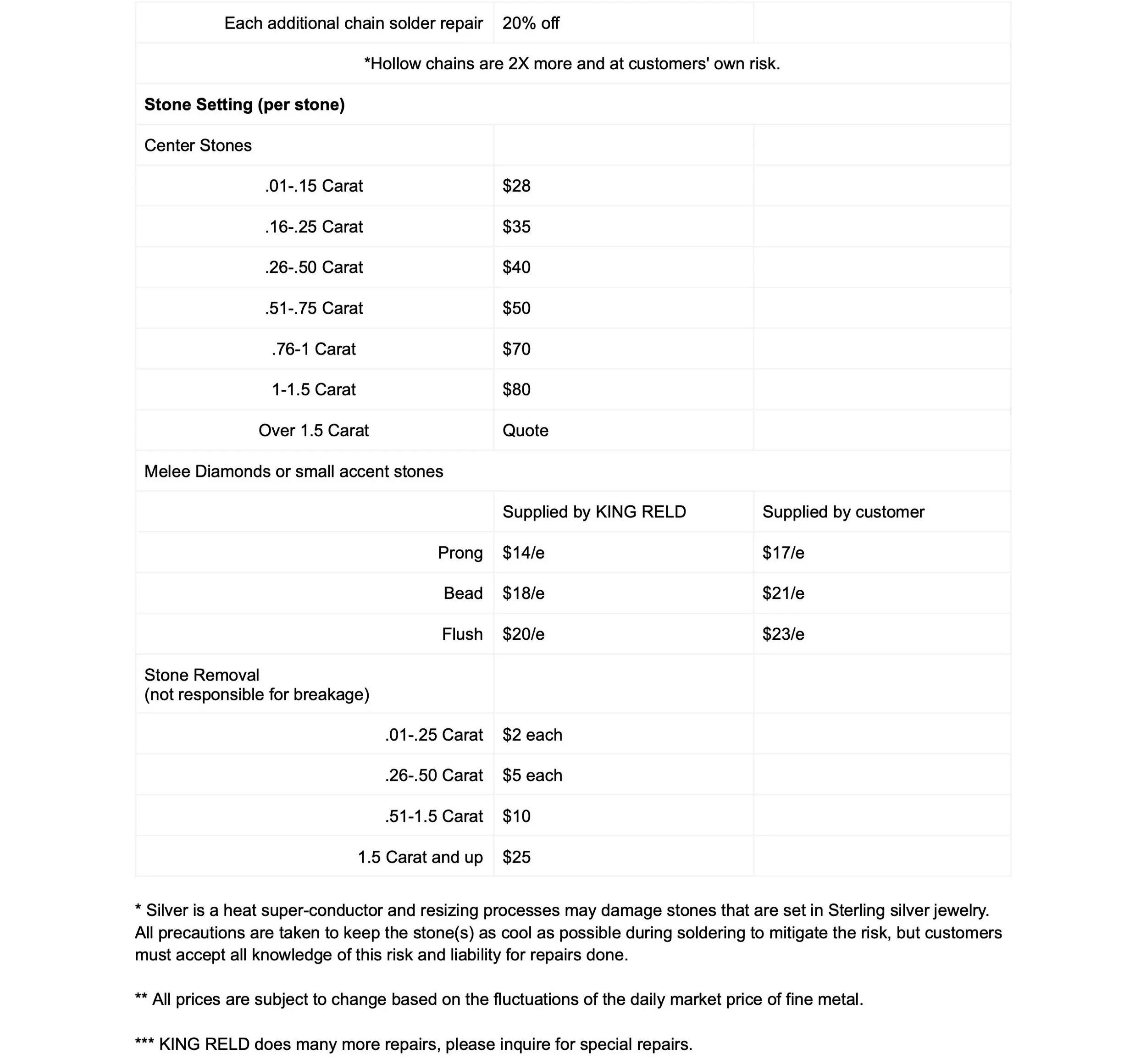 KING RELD offers a wide variety of repairs. We service many types of different kinds of pieces like heirloom jewelry, gemstone jewelry, old estate jewelry, broken chains, poorly sized rings. We can also replace and source gemstones and diamonds. Additionally, we offer cleaning, polishing, and appraisal services.